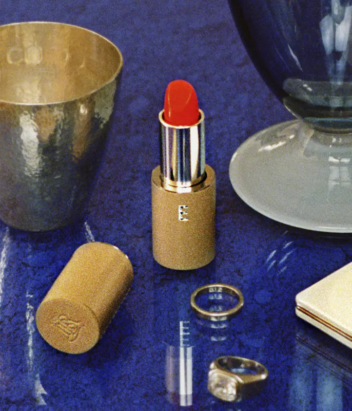 Alex Eagle is all about beauty: the beauty of the exclusive orange-red lipstick with its matte finish. Beauty of the beige leather case. The beauty of an illuminated color duo.