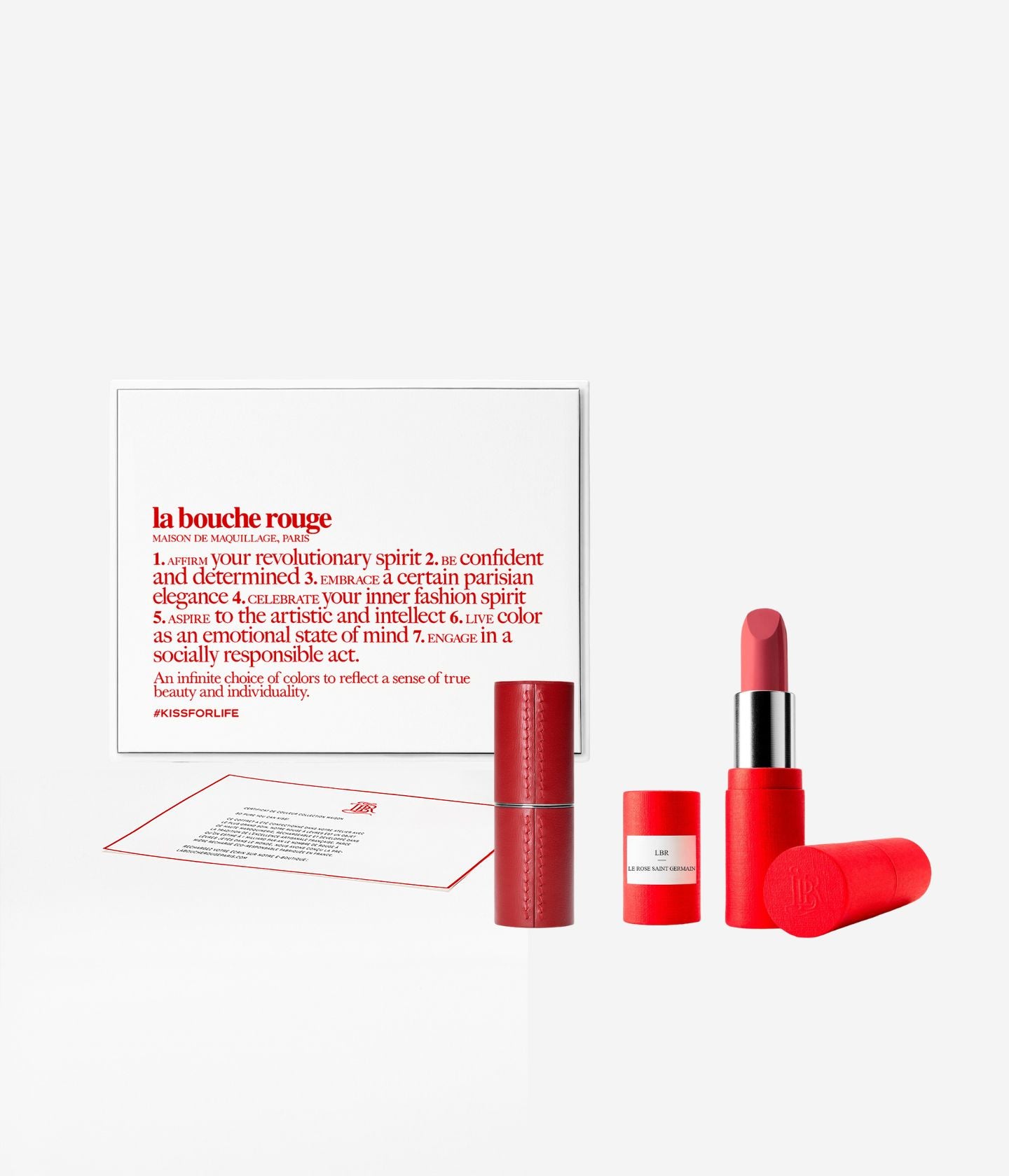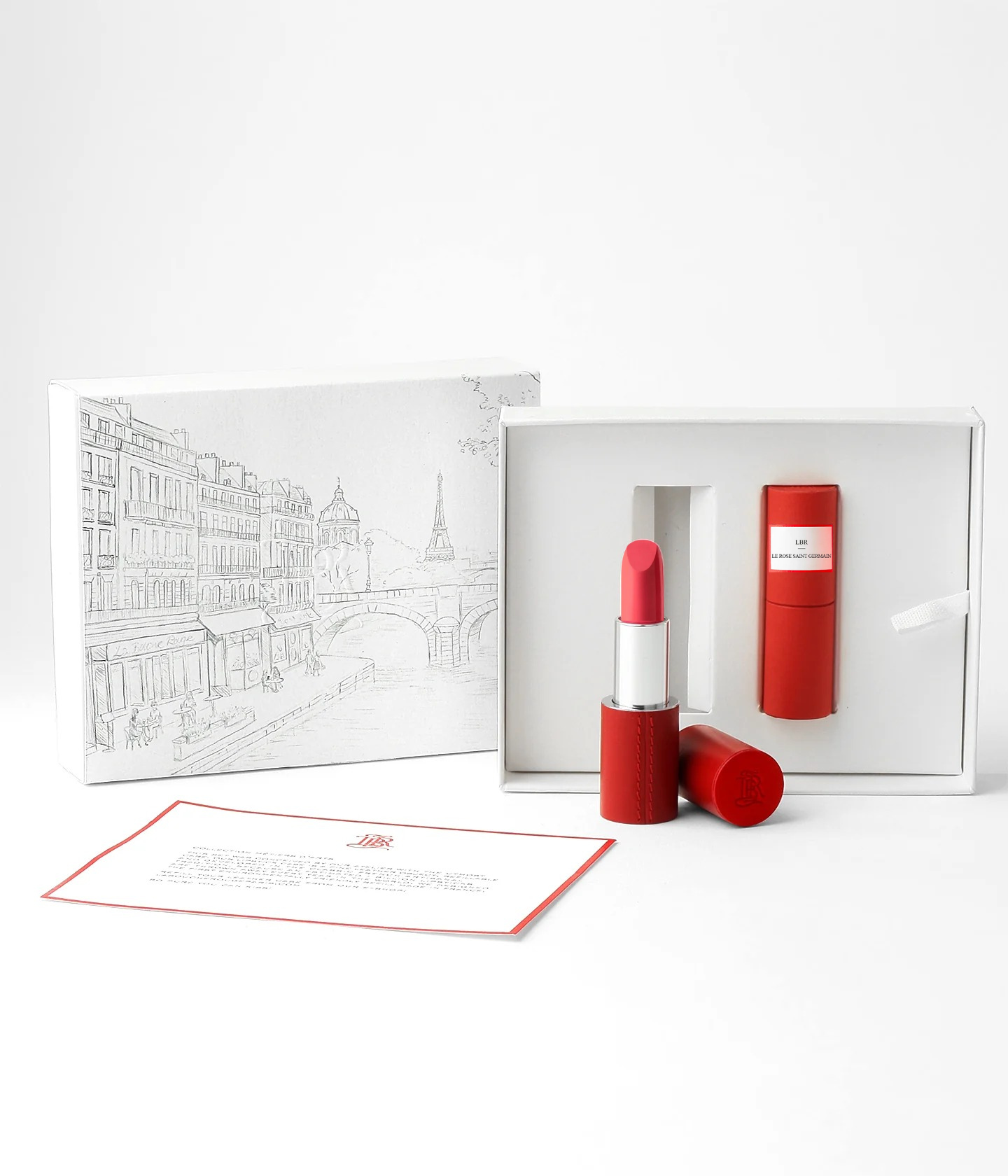Ce coffret contient le rouge à lèvres Le Rose Saint-Germain, accompagné d'un écrin en cuir rouge rechargeable et un fourreau inédit illustré d’une esquisse de Paris au trait noir, dessinée à la main.