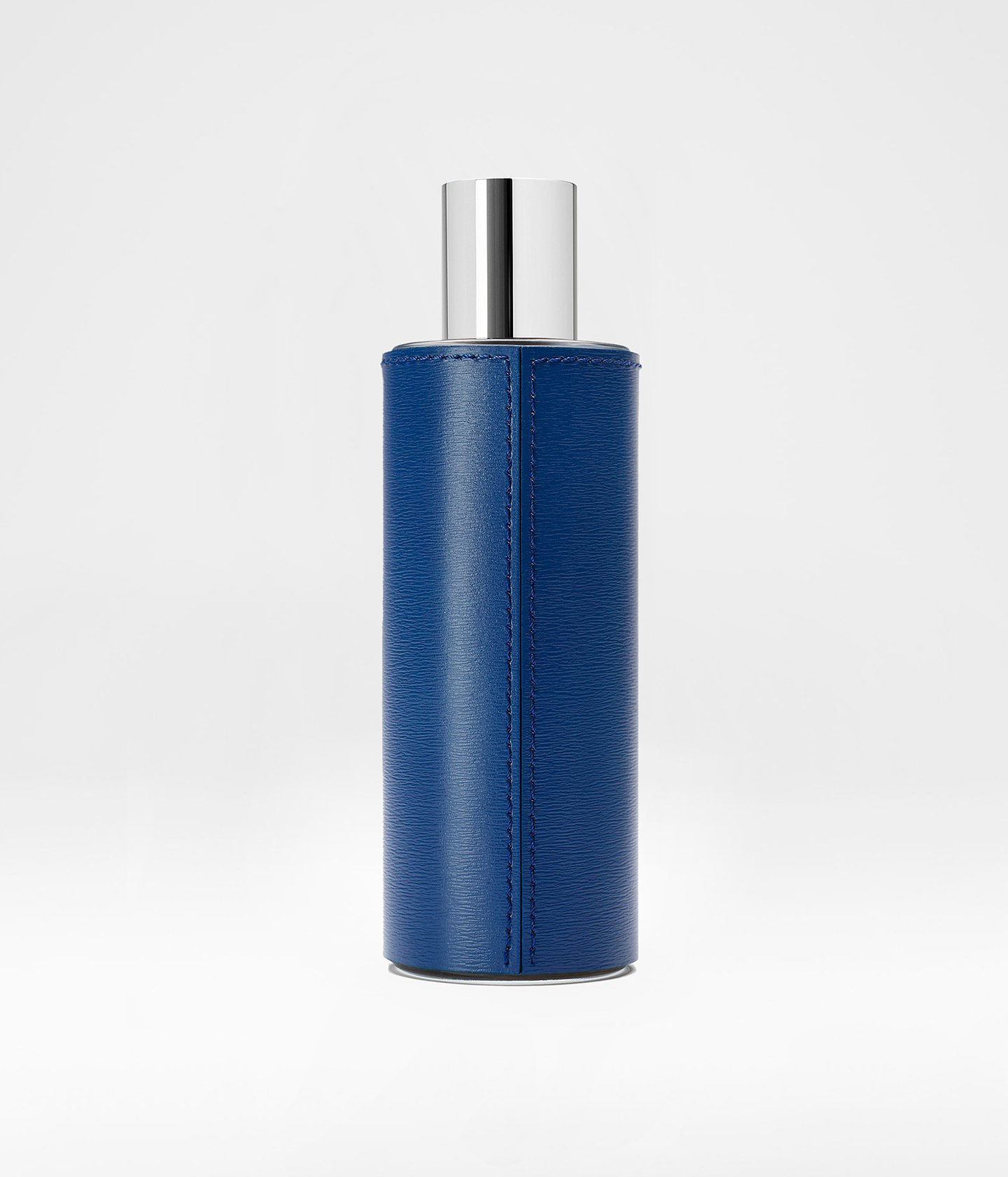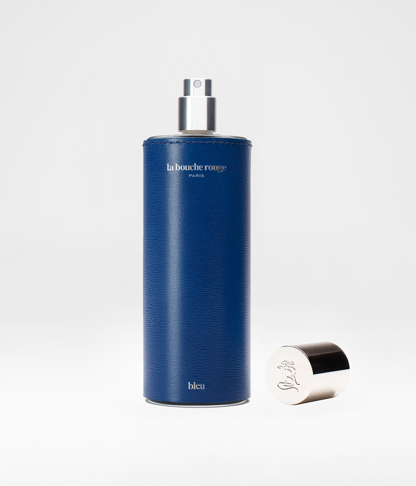 Un flacon en verre 100 ml, gainé à la main d'un précieux cuir bleu marine. Capot en métal, intérieur serti de liège, une innovation.
