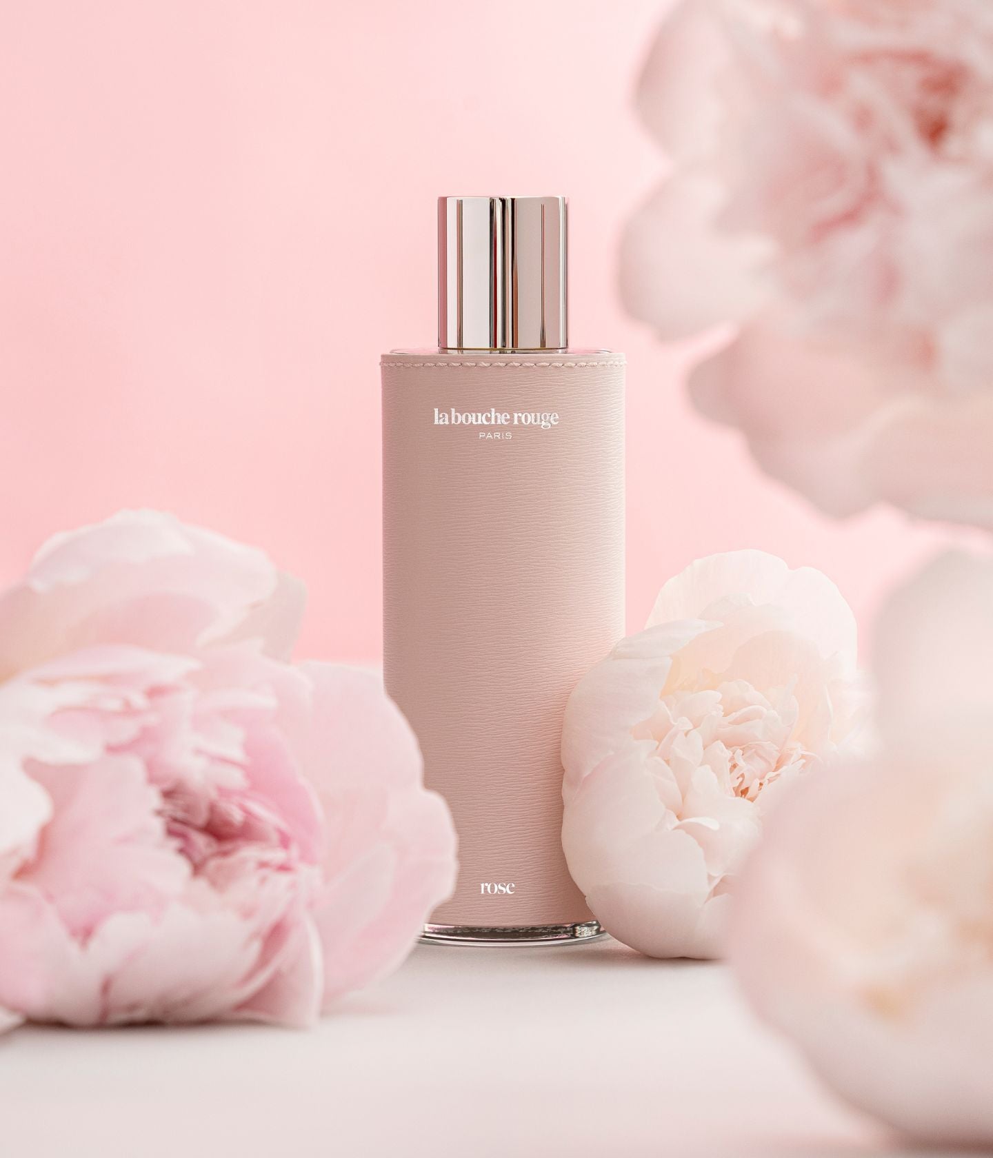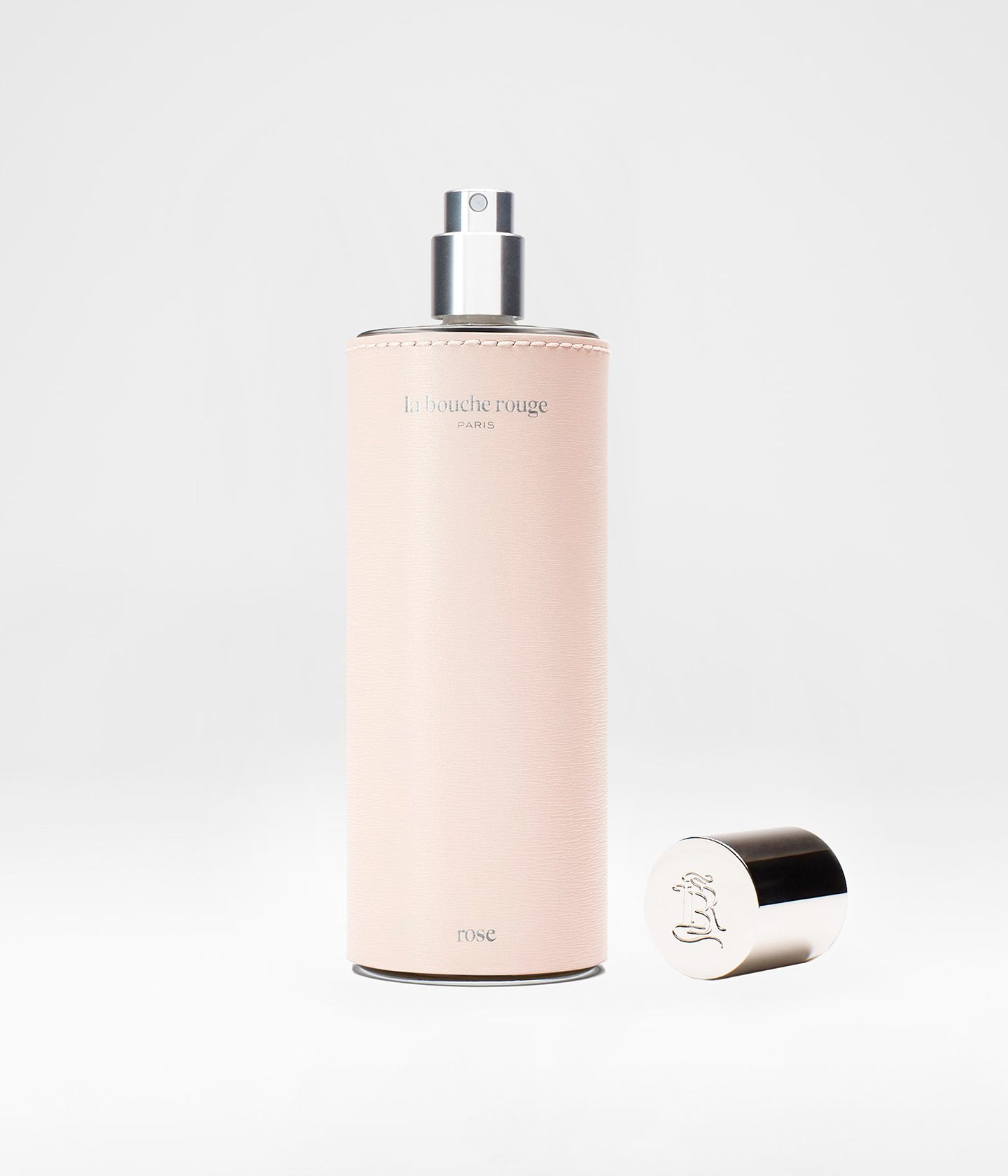 Un flacon en verre 100 ml, gainé à la main d'un précieux cuir rose. Capot en métal, intérieur serti de liège, une innovation.