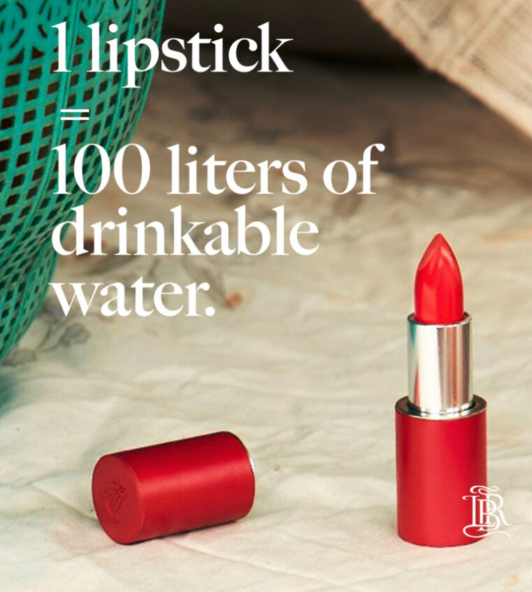 The lack of water being one of the leading causes of infant mortality today, we support Eau Vive Internationale. For each lipstick sold, we provide 100 liters of drinking water to the association.