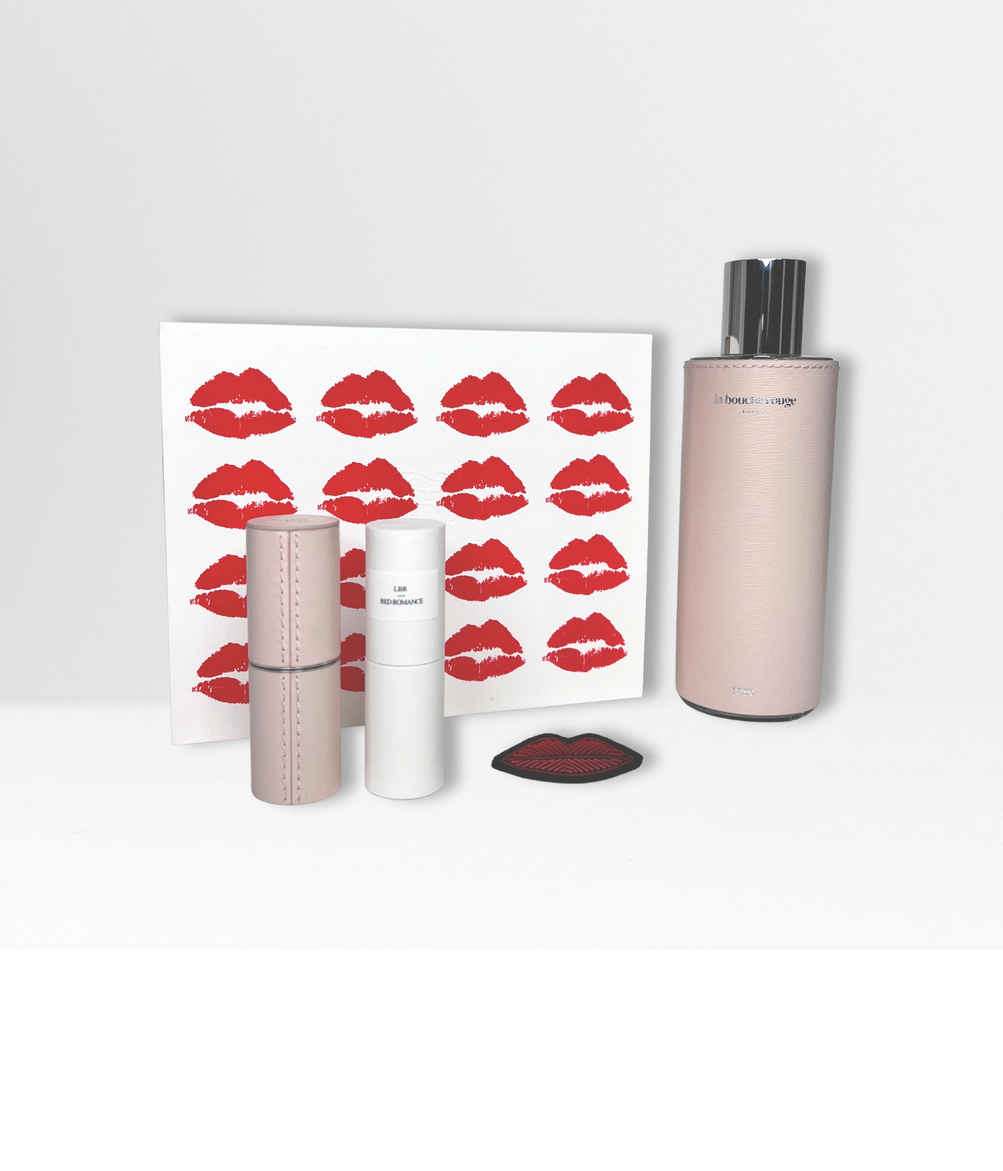 - du coffret Saint-Valentin Red Romance, contenant un écrin rechargeable en cuir rose et une recharge du rouge à lèvres Red Romance, un rouge rosé intense au fini mat, habillé de son fourreau imprimé Bisous,