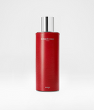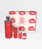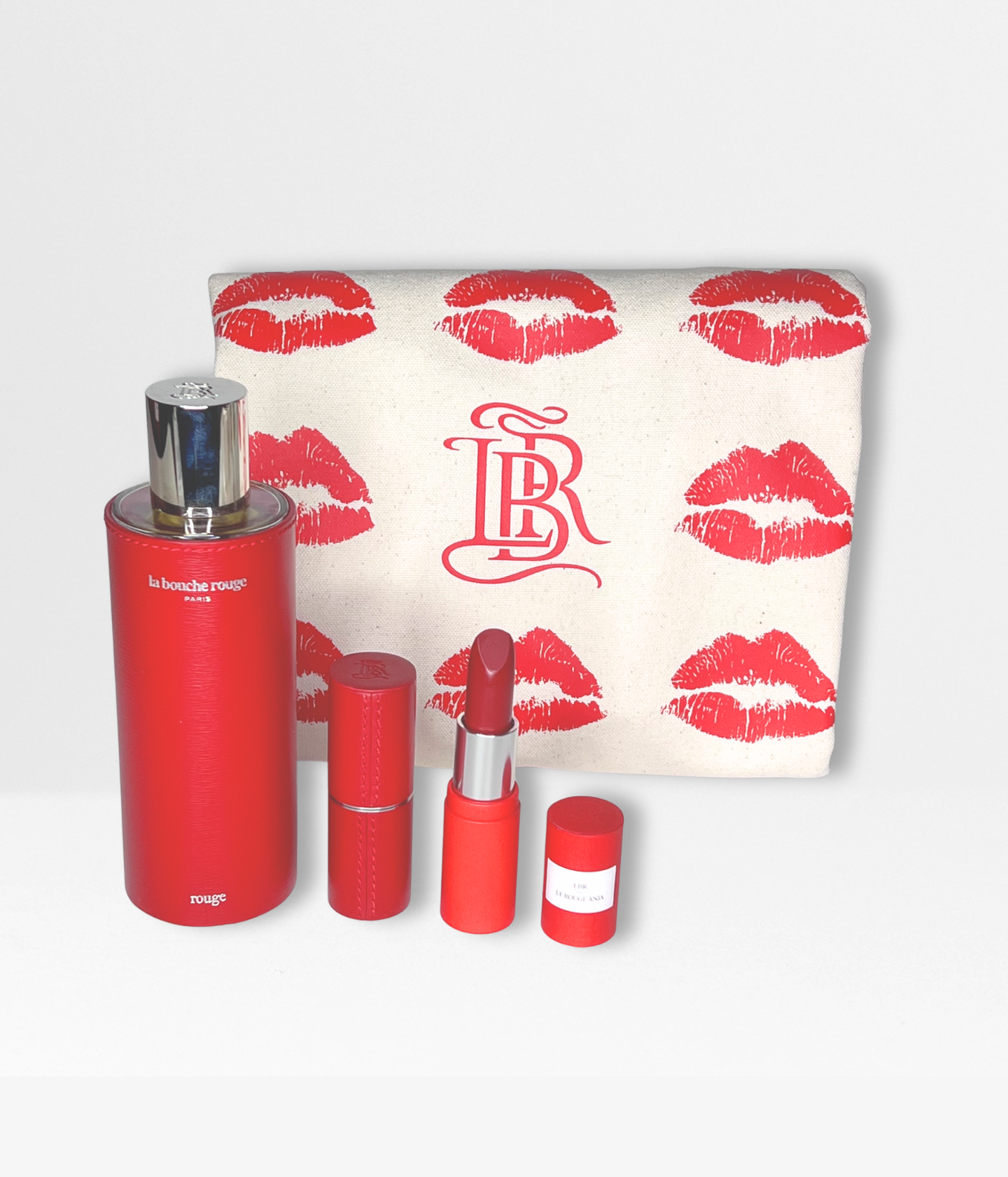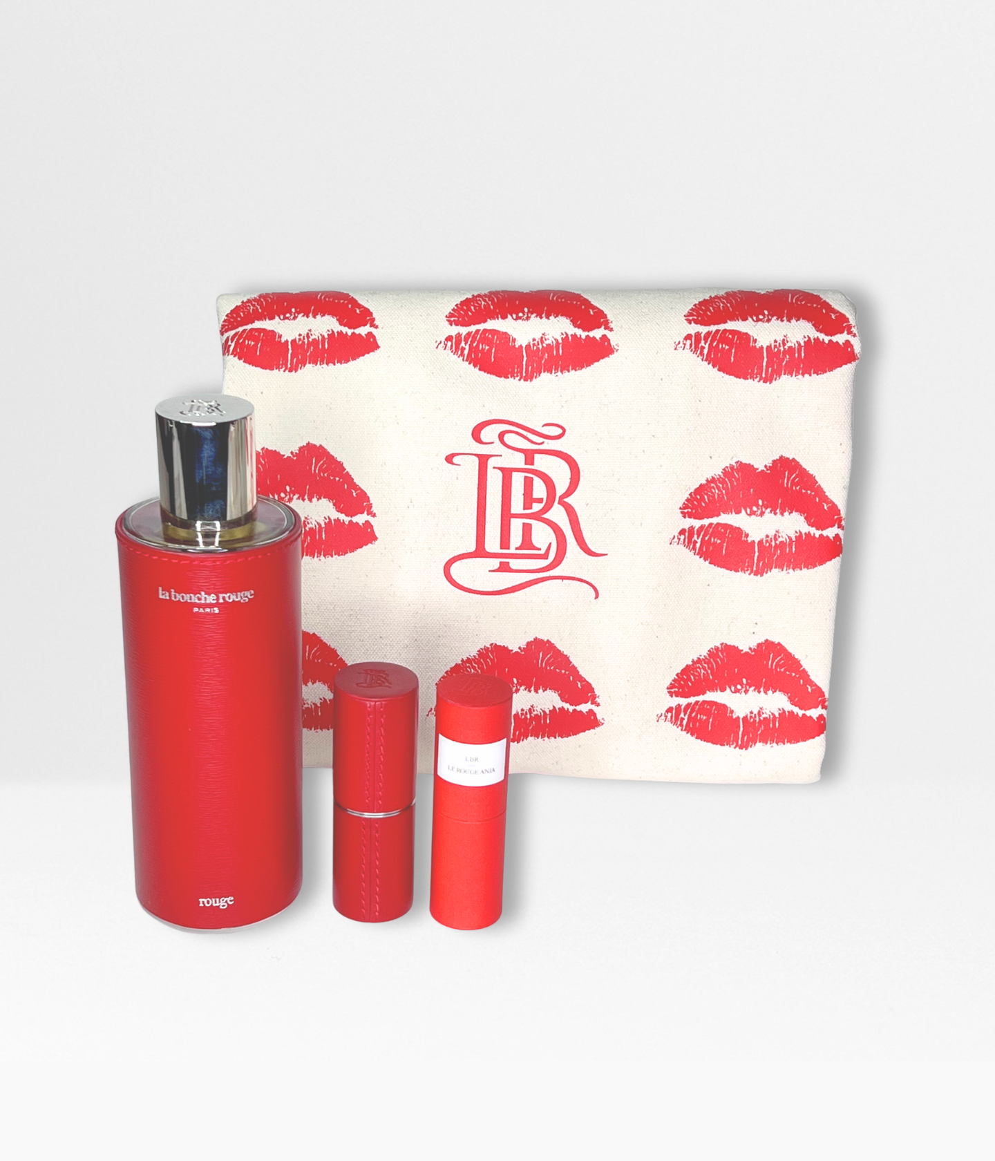 A red perfume extract with an enveloping trail, an iconic refillable red leather case—personalizable—the Anja lipstick refill in a cool-toned red, structured, of timeless elegance with a satin finish, and a Bisous printed tote bag, all presented in a beige cotton dust bag.