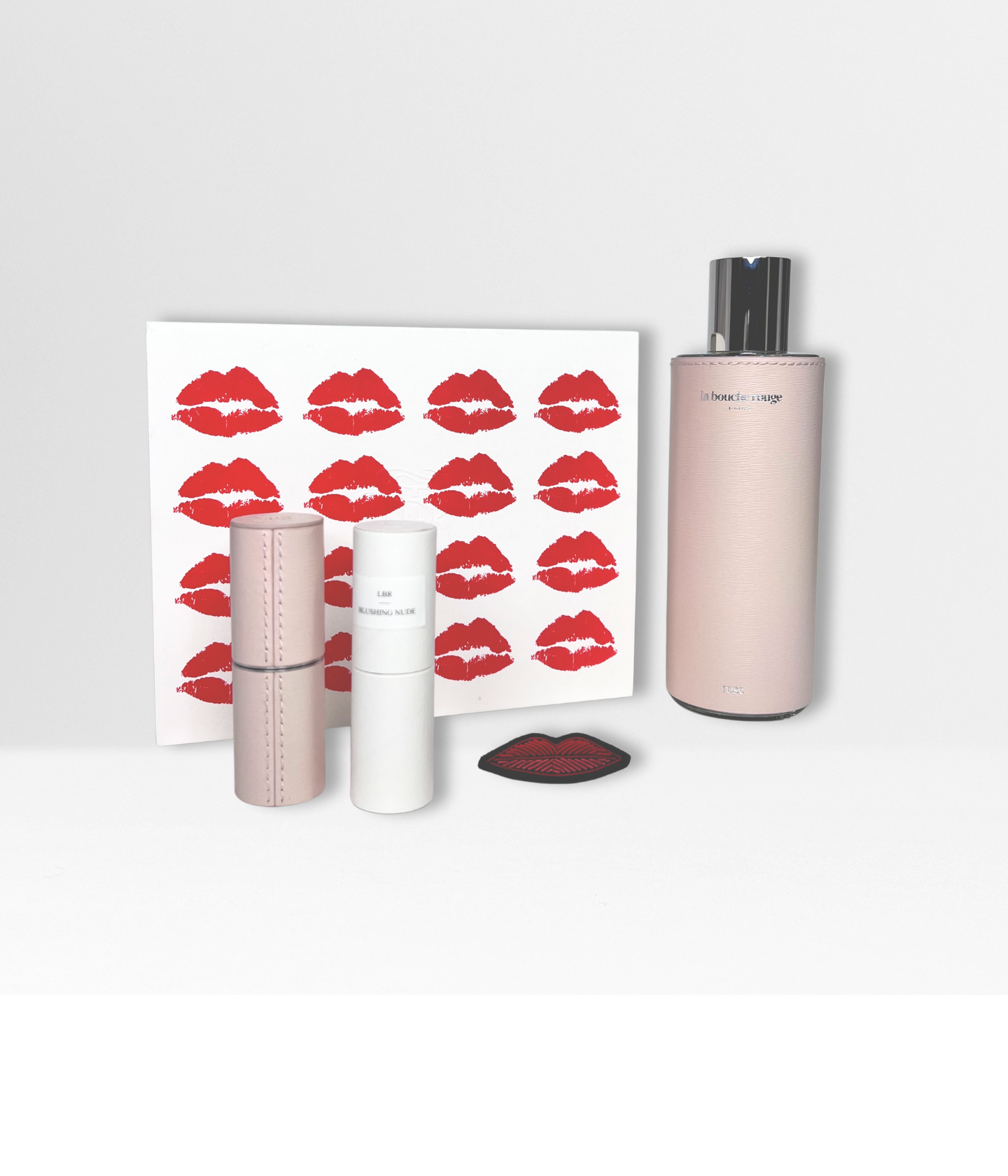 the Blushing Nude Valentine’s Day box, dressed in its Bisous printed sleeve, featuring a refillable pink leather case and a Blushing Nude lipstick refill, a delicate mat rosy nude,