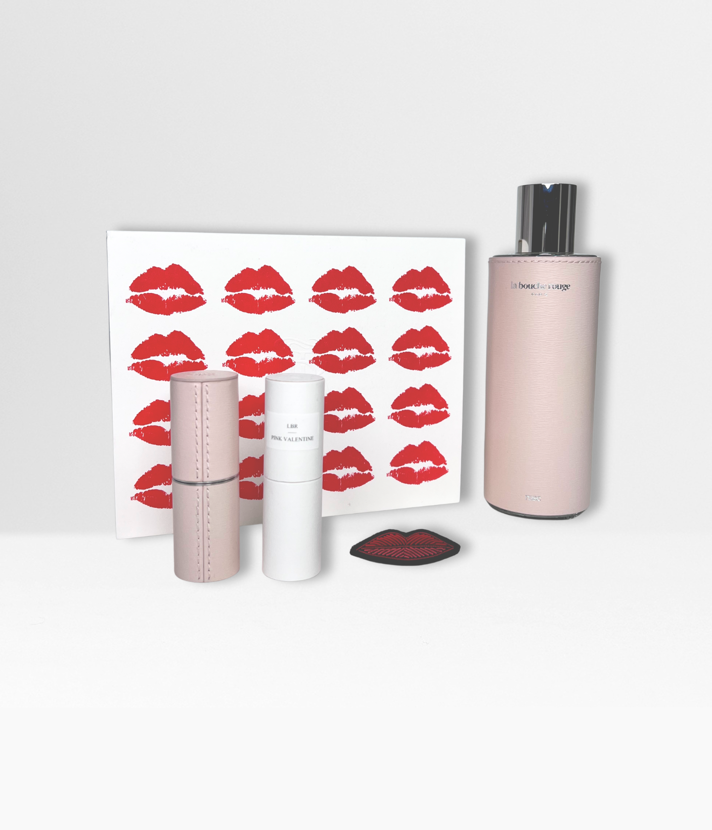 - the Pink Valentine Valentine’s Day box dressed in its Bisous printed Sleeve, featuring a refillable pink leather case and a Pink Valentine lipstick refill, a radiant satin pink,
