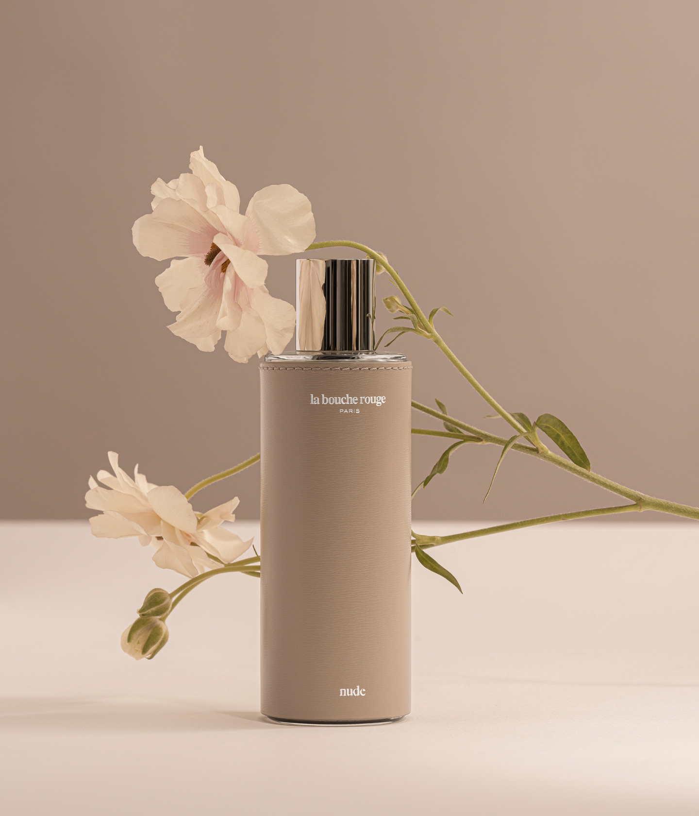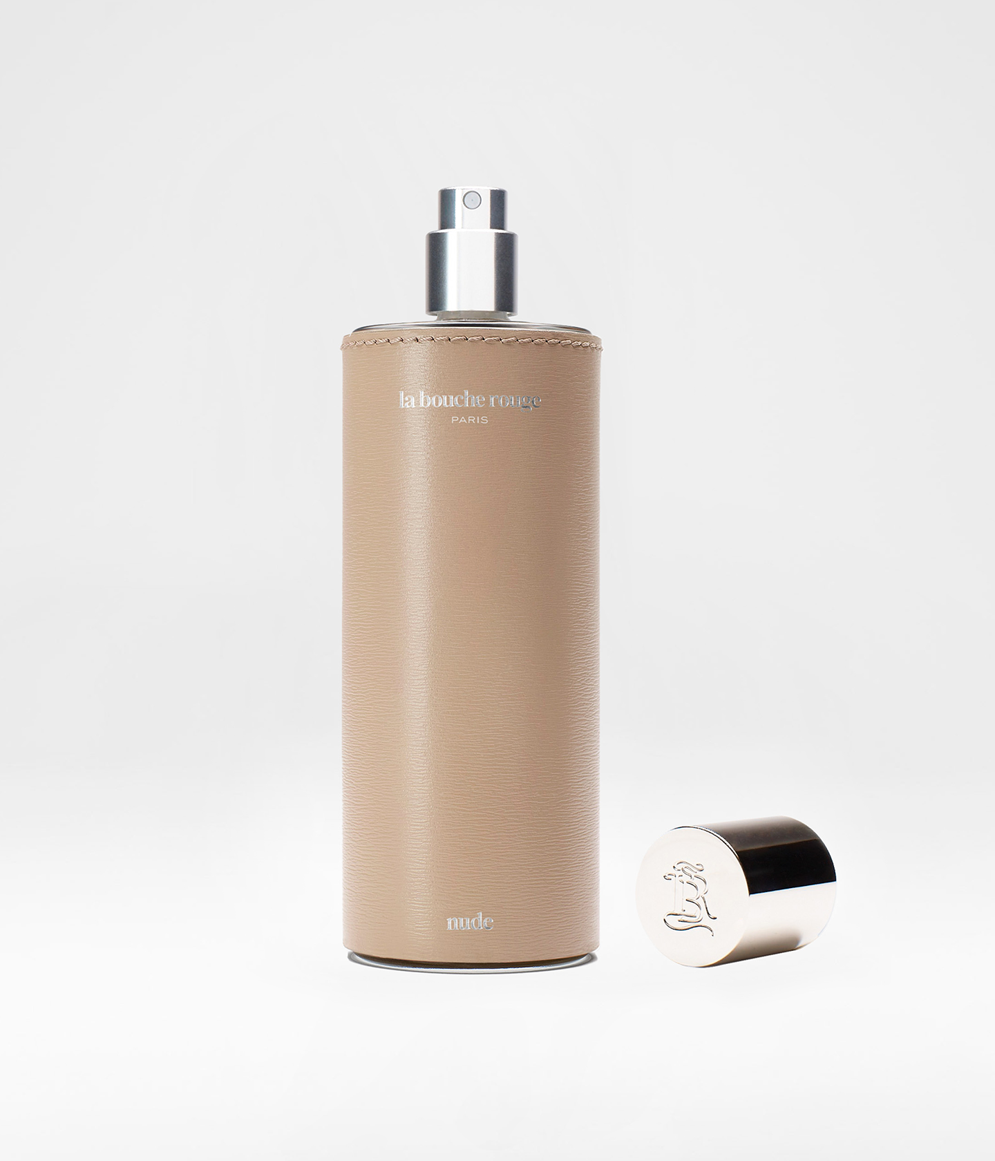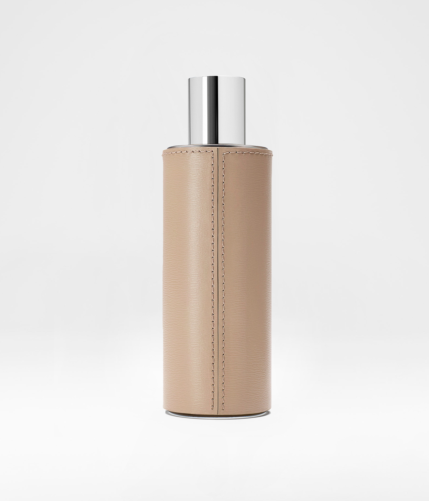 A 100ml sustainable glass bottle, housed in a precious handmade beige leather case.